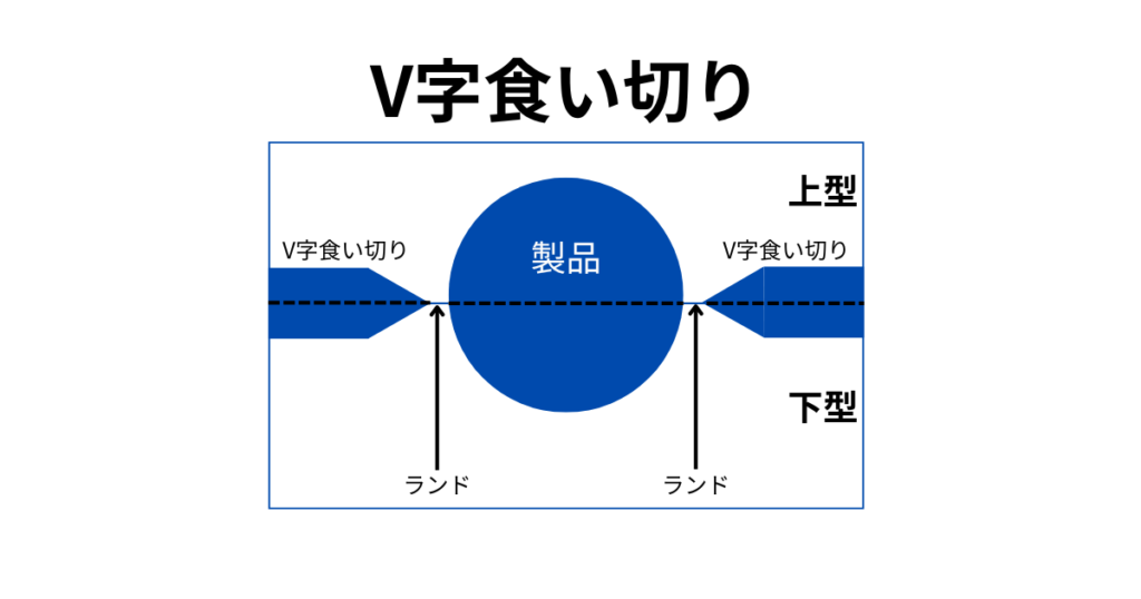 このランドによって、キャビティ内の圧力による食い切り溝の摩耗を防ぎ、金型寿命を延ばす。 - ランドの長さ、厚み、食い切り溝の角度が重要。バリ取りができるために、この3点のバランスが肝になる。